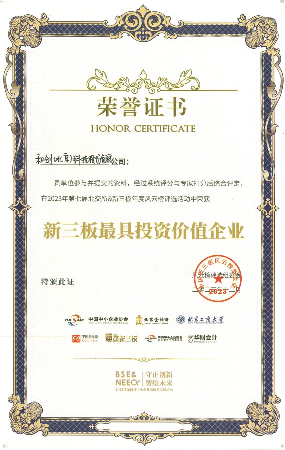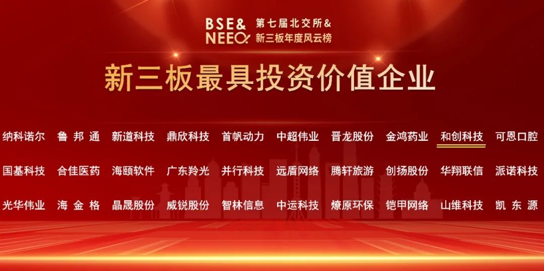 經由北交所及新三板投資者保護指數綜合評選,和創科技榮獲第七屆北交所&新三板年度風云榜盛典“新三板最具投資價值企業”,和創科技創始人/總經理劉學臣被評為“新三板優秀企業家”。