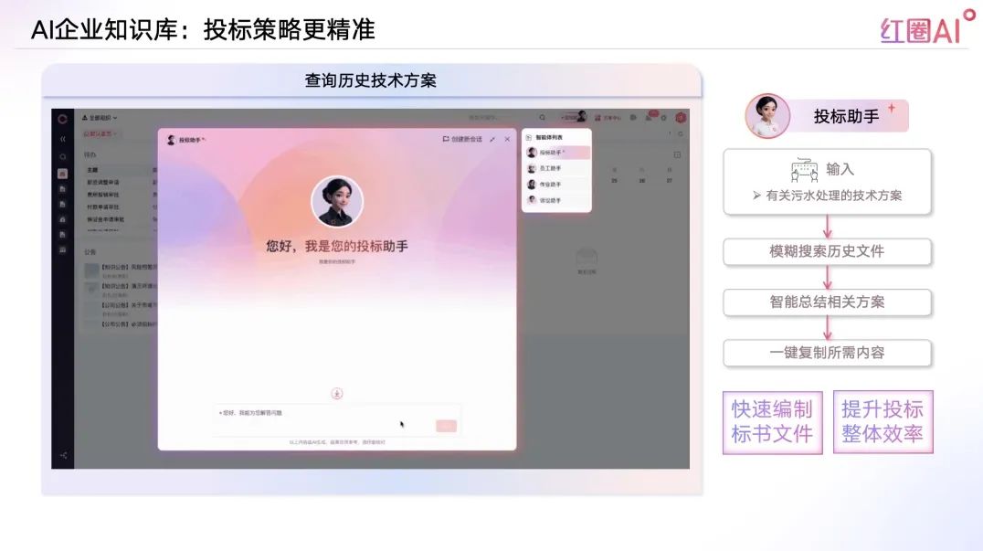 以往投標流程中,資料查找和內容比對耗時耗力、風險頻發。紅圈AI通過快速檢索歷史標書、技術方案、成功案例等內容,助力企業建立專屬“投標智庫”,讓策略制定更具數據支撐。