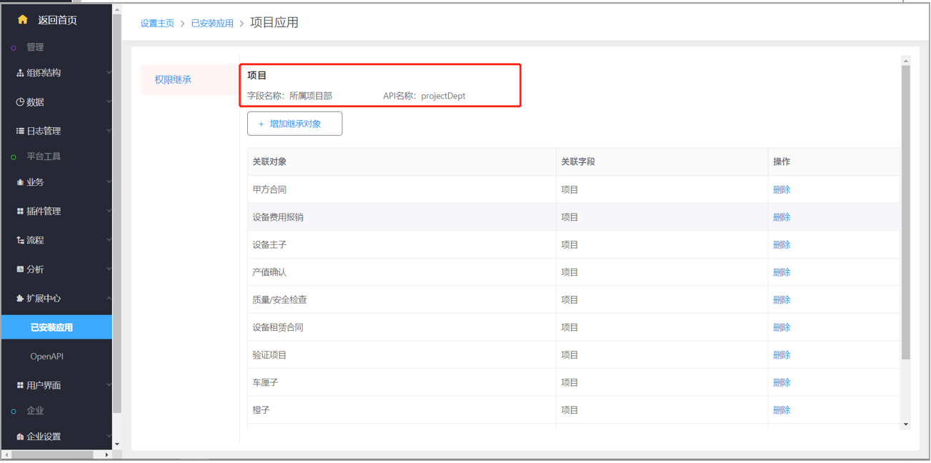 為實現項目及其相關對象的矩陣型權限控制,以及相關對象與項目權限的一致性,v2101 在權限管理上進一步推出了項目多維度和權限繼承能力,擴展中心新增項目應用。此應用為項目及相關對象插入部門字段,結合項目型組織,實現對象雙部門結構,雙權限體系,保證項目下相關對象的數據,在項目部門維度下,與項目保持一致。如果員工A是項目1的成員就可以通過此功能快速設置獲得項目1下所有對象的相關信息而不需要通過添加跟進人的形式進行權限設置。
