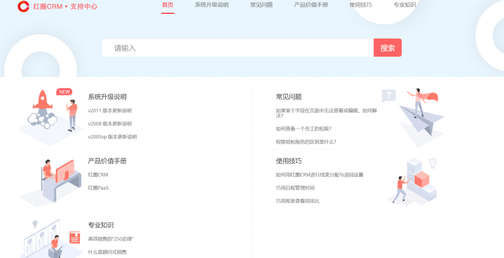 支持中心包含產品價值手冊、版本更新說明、常見問題、常用技巧和專業知識五部分,用戶可方便查找相關內容。在前臺頁面右上角點擊“支持中心”可直接進入支持中心。