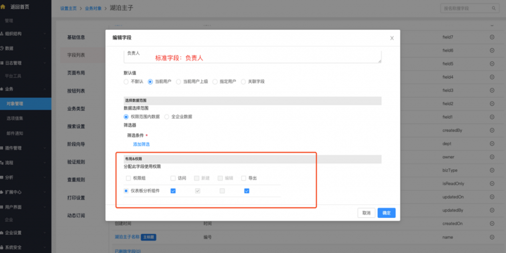 - 系統字段及按鈕修改權限配置:系統字段、標準字段(所屬部門及負責人)、按鈕支持在編輯時修改權限