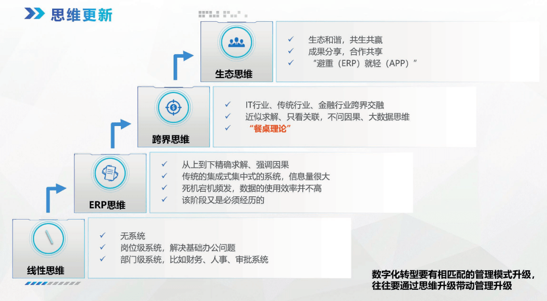 思維模式可以分為線性思維、ERP思維、跨界思維和生態(tài)思維。不同的思維方式會影響企業(yè)數(shù)字化的進程(圖6)。