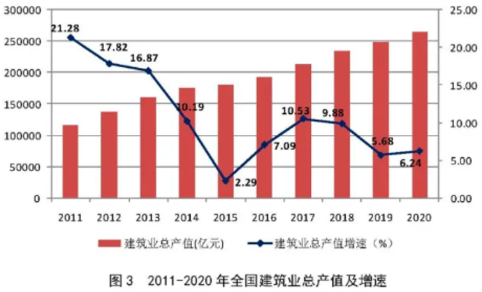 自2011年以來,建筑業增加值占國內生產總值的比例始終保持在6.7%以上;2020年再創歷史新高,達到了7.18%。在2015年、2016年連續兩年下降后連續4年保持增長,建筑業國民經濟支柱產業的地位穩固。