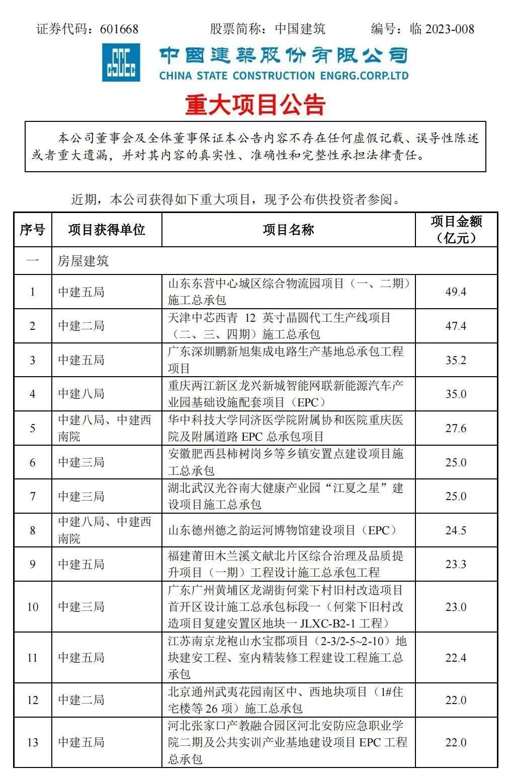 中國(guó)建筑20家子公司凈利潤(rùn)出爐!附2023中標(biāo)重大項(xiàng)目名單!
