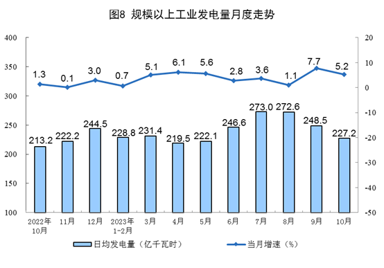 電力生產穩(wěn)步增長。10月份,發(fā)電量7044億千瓦時,同比增長5.2%,增速比9月份放緩2.5個百分點,日均發(fā)電227.2億千瓦時。1—10月份,發(fā)電量73330億千瓦時,同比增長4.4%。
