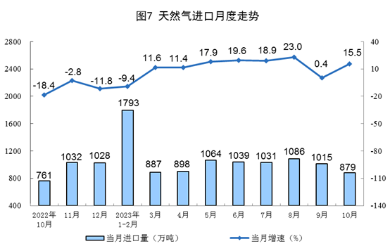 天然氣生產保持平穩(wěn),進口增速加快。10月份,生產天然氣190億立方米,同比增長2.6%,增速比9月份回落6.7個百分點,日均產量6.1億立方米。進口天然氣879萬噸,同比增長15.5%,增速比9月份加快15.1個百分點。